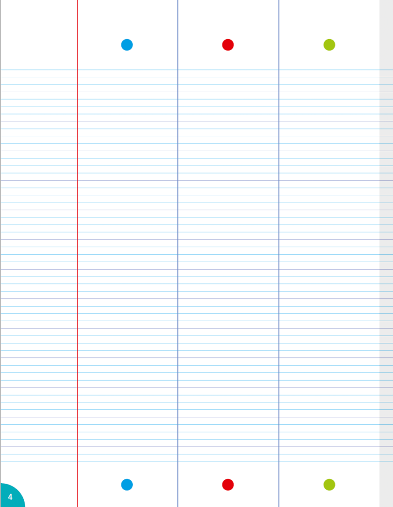• Un lignage qui se rapproche le plus possible de celui d’un cahier Seyès traditionnel et permet de découvrir sa structure (marge, lignes, interlignes, etc.). Il est allégé des lignes verticales sauf celles des colonnes.