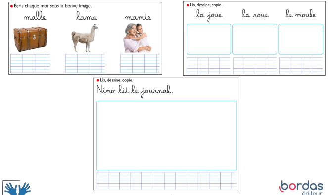 Nous avons la chance de pouvoir proposer toutes ces étapes: oralisation, lien lecture/écriture, apport de l’image mental, stratégies de copie… dans la collection des cahiers d’écriture Bordas pour tous.