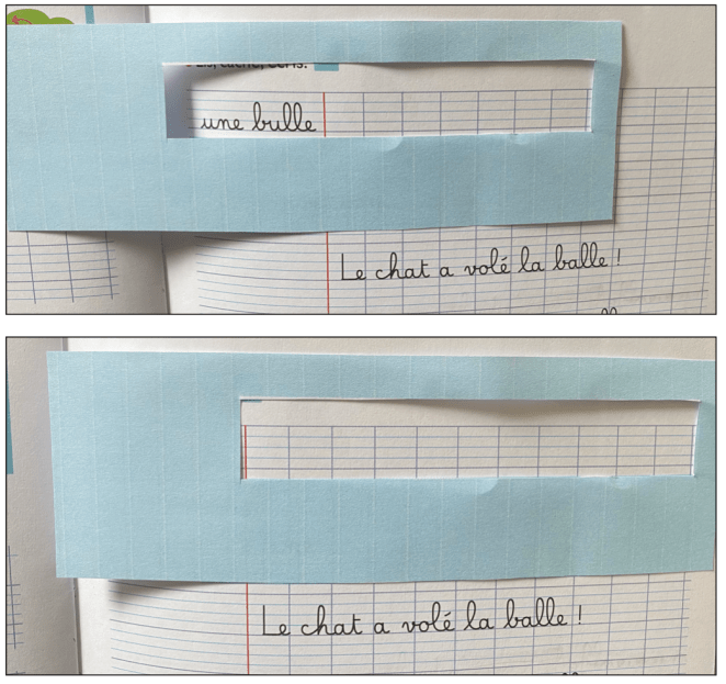 A partir du CP, différents exercices de stratégies de copie sont proposés tout au long de l’année: cache-lecture, lis-dessine-copie, copie couleurs…