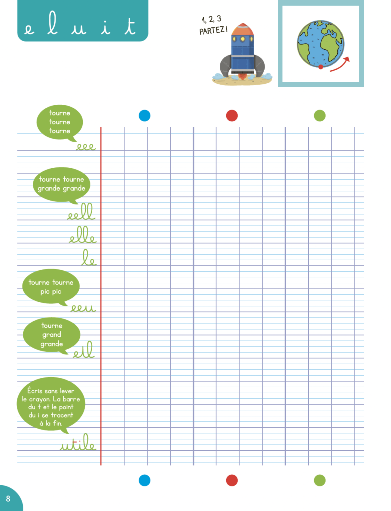 Dans les premières pages, des colonnes marquées d’un point bleu  , vert  et rouge  sont un guide de placement du bras. Quand l’élève, droitier comme gaucher, écrit dans la colonne bleue, son avant-bras doit cacher le point bleu en bas de la colonne. Il doit pour cela, orienter convenablement le cahier.