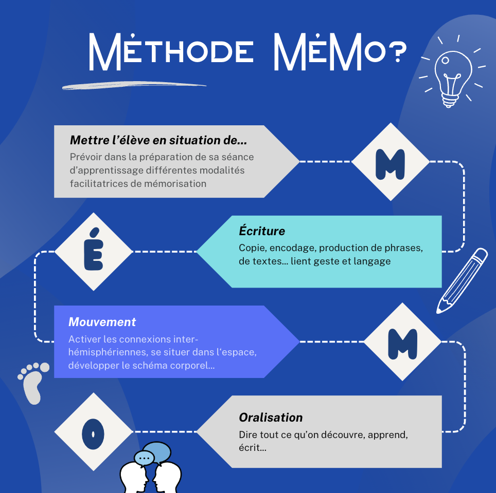 Cette méthode part du constat que pour accéder à une mémorisation durable, une imprégnation des notions, l’automatisation des techniques, le transfert des savoirs… l’élève doit avoir eu l’occasion de mettre en oeuvre au moins deux des trois points: écrire, bouger, oraliser.