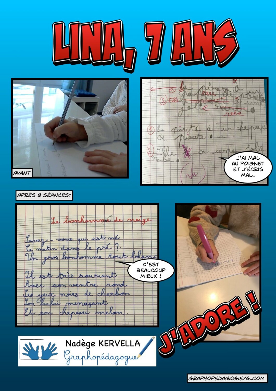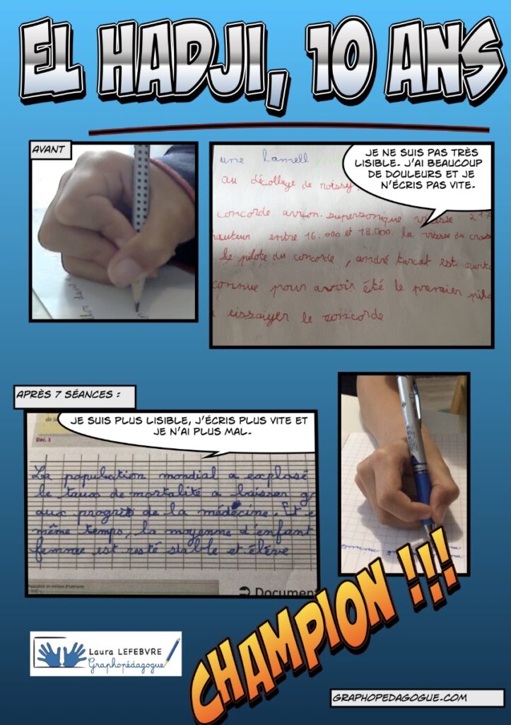 « J’écris mal, je suis lente et c’est souvent illisible », voici les mots d’Anaïs lors de notre rencontre au cabinet. Aujourd’hui, je te félicite, tu peux être fière de toi ! Tu mérites ces beaux changements et je te souhaite une excellente continuation. Merci pour ta bonne humeur et ton sourire.