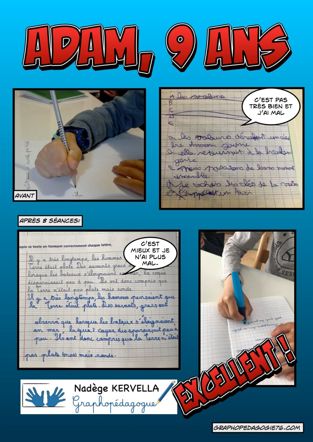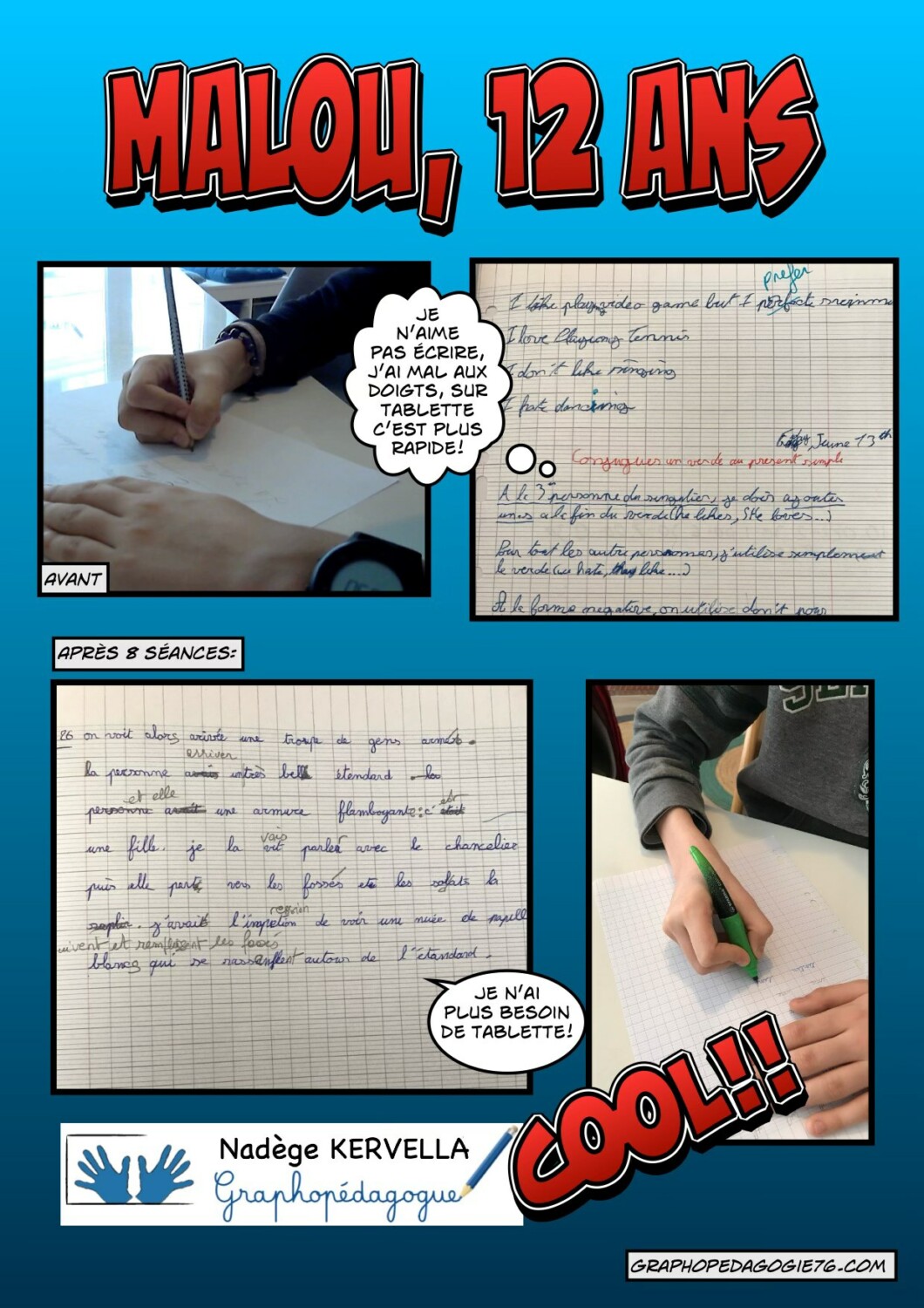 Bravo Joseph, te voilà prêt pour la sixième ! Grâce à ton travail, au revoir douleur, illisibilité et lenteur. Tu peux être fier de toi. Merci pour ta bonne humeur, ça a été un plaisir de t’accompagner. Bonne continuation !