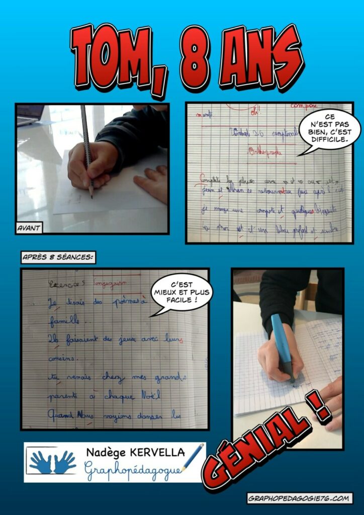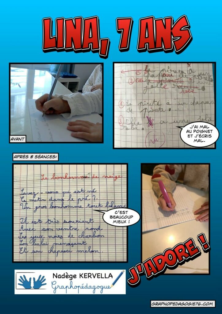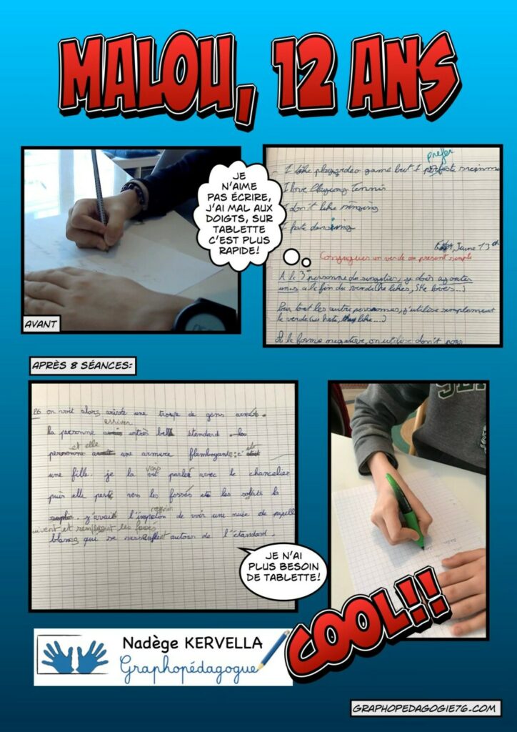 Les problèmes d’écriture ne semblent pas toujours évidents au premier abord. Jeanne avait une très belle écriture mais pas du tout confortable. Je quitte Jeanne aujourd’hui avec une nouvelle tenue de crayon, une écriture toujours aussi jolie mais sans douleurs et plus rapide. Elle avoue même qu’elle aime bien écrire maintenant .